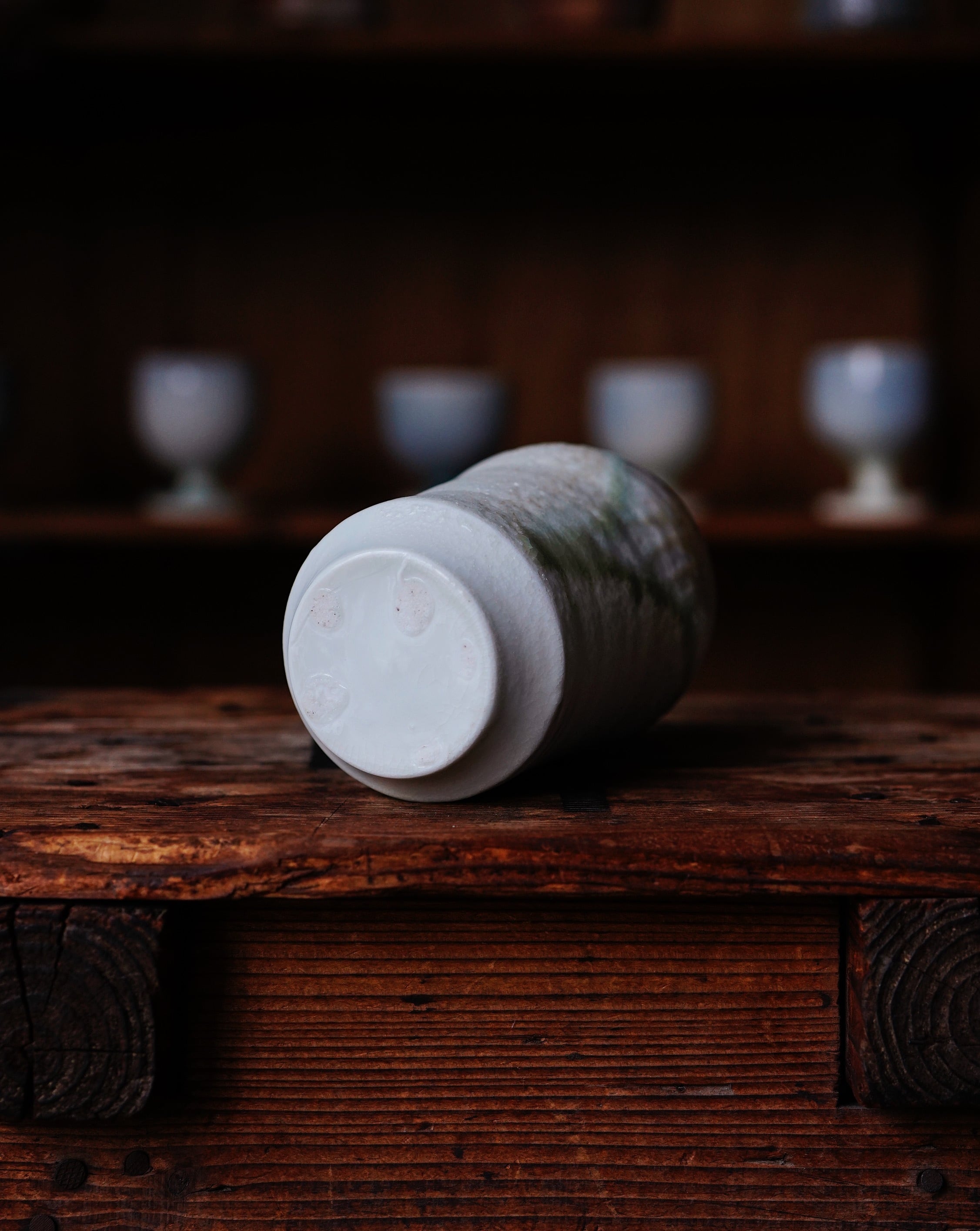 基本的には轆轤による造形は今までと比べて大きな変化はないものの、轆轤成形後に行っていたどべでの装飾や鎬による表現は姿を消し、白磁をキャンパスにして自然釉で景色を描いていくという表現に変化しています。