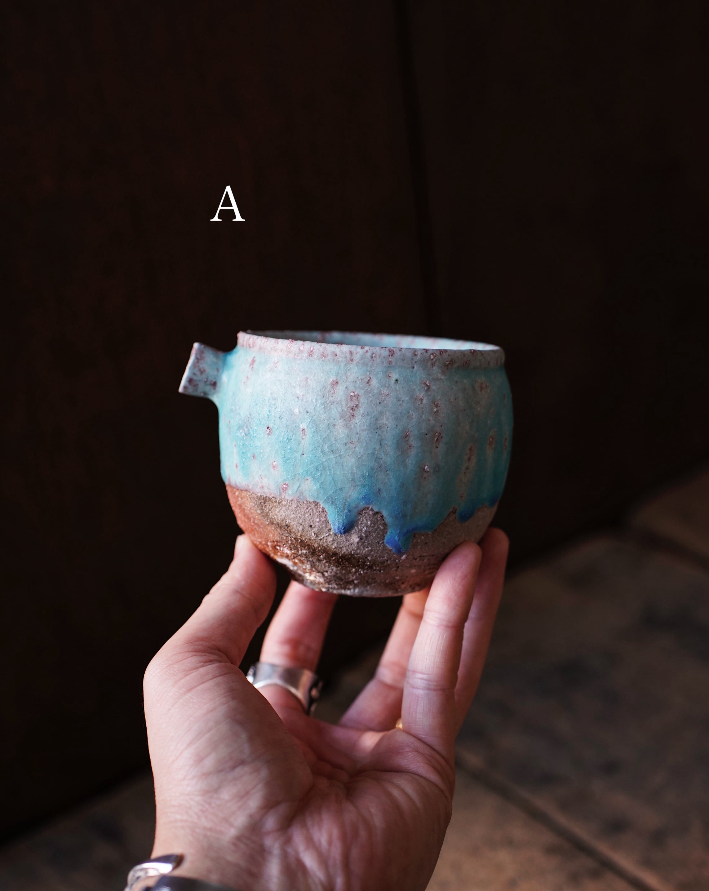 トルコ釉はそのままでも美しい青に発色するため、薪窯で焼成することでその特徴を奪ってしまうのではないかと思われるところですが、トルコ釉の上から更にさまざまな木々の灰が降りかかることで、人のコントロールを超えた美しさを見せてくれます。