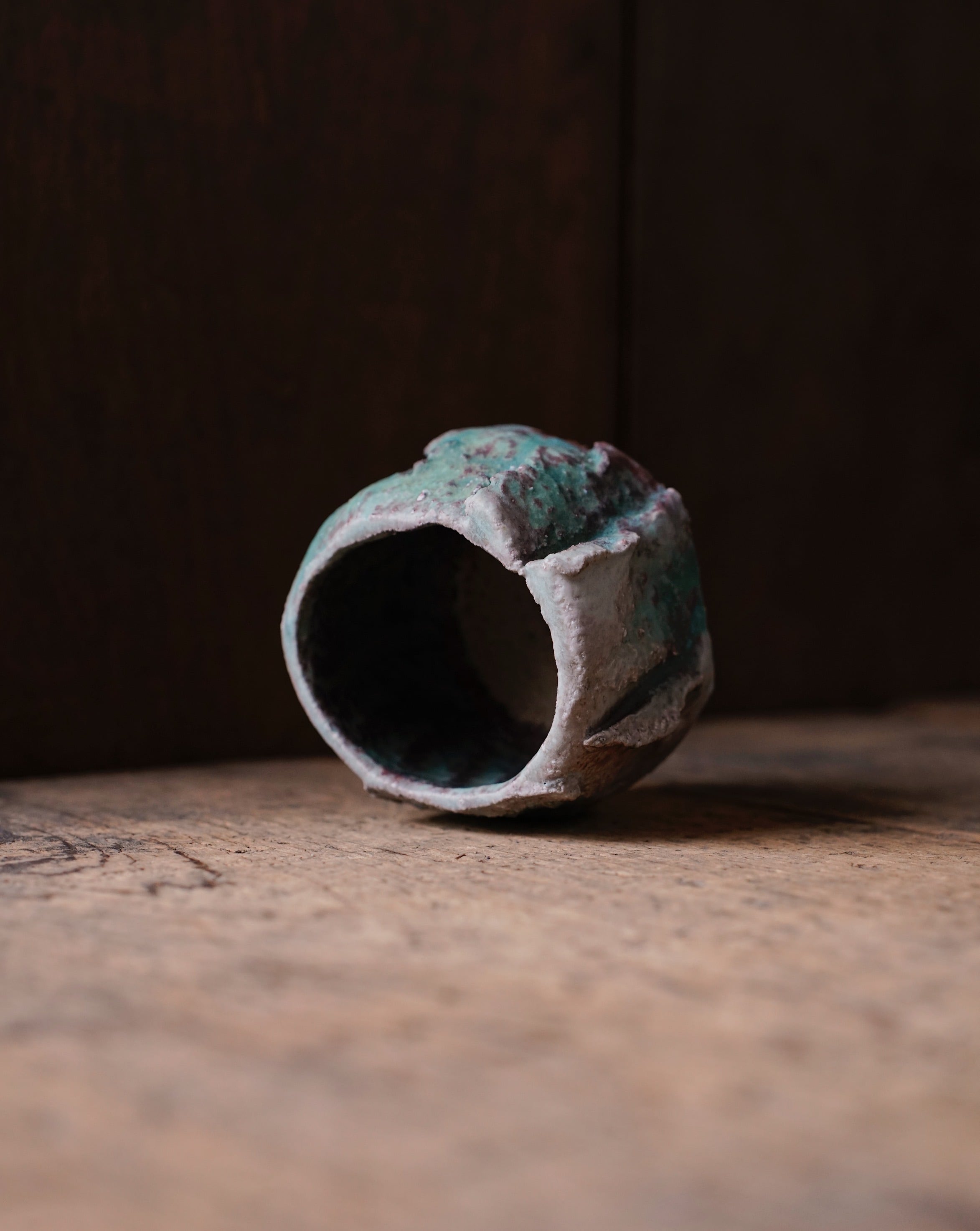 トルコ釉はそのままでも美しい青に発色するため、薪窯で焼成することでその特徴を奪ってしまうのではないかと思われるところですが、トルコ釉の上から更にさまざまな木々の灰が降りかかることで、人のコントロールを超えた美しさを見せてくれます。