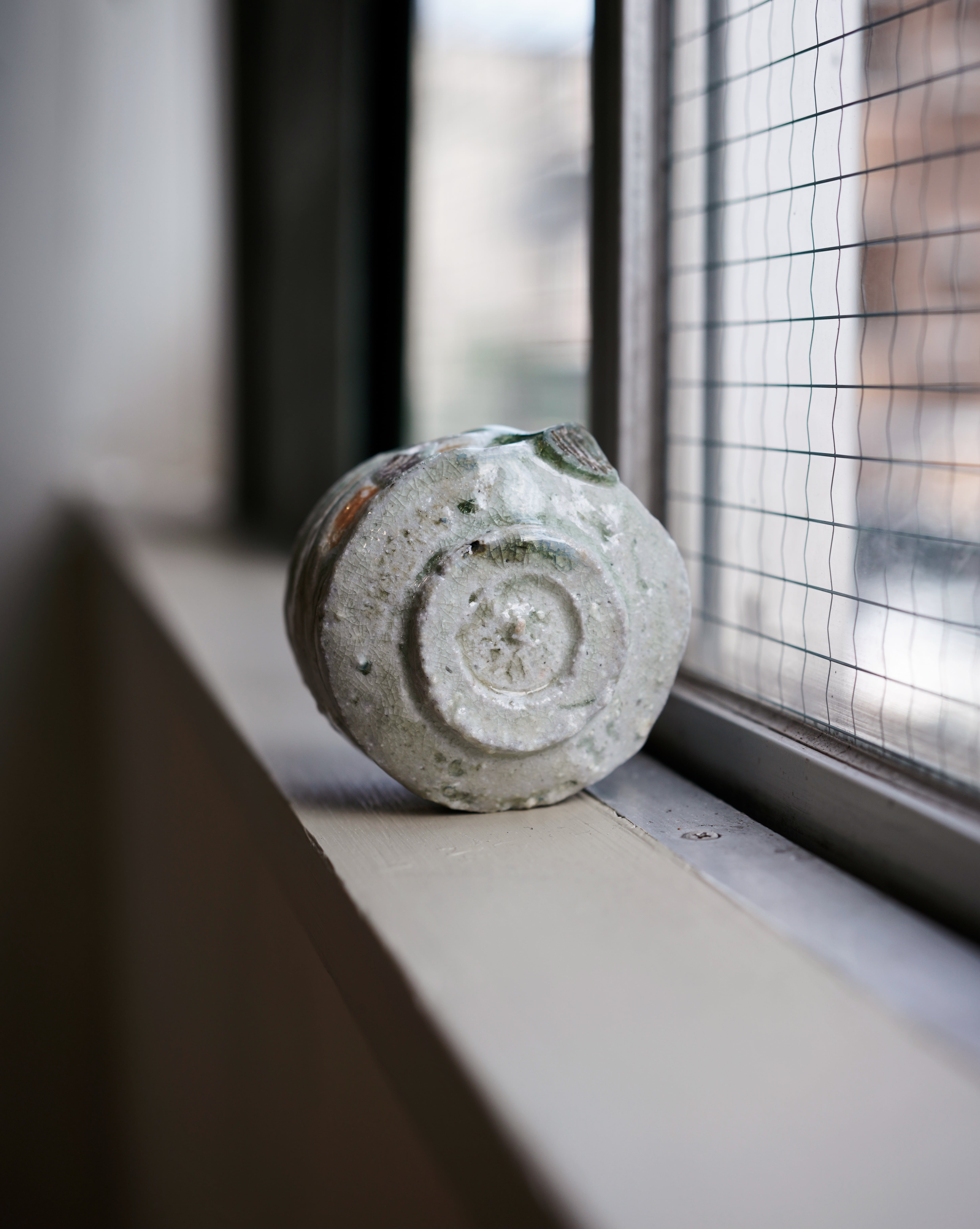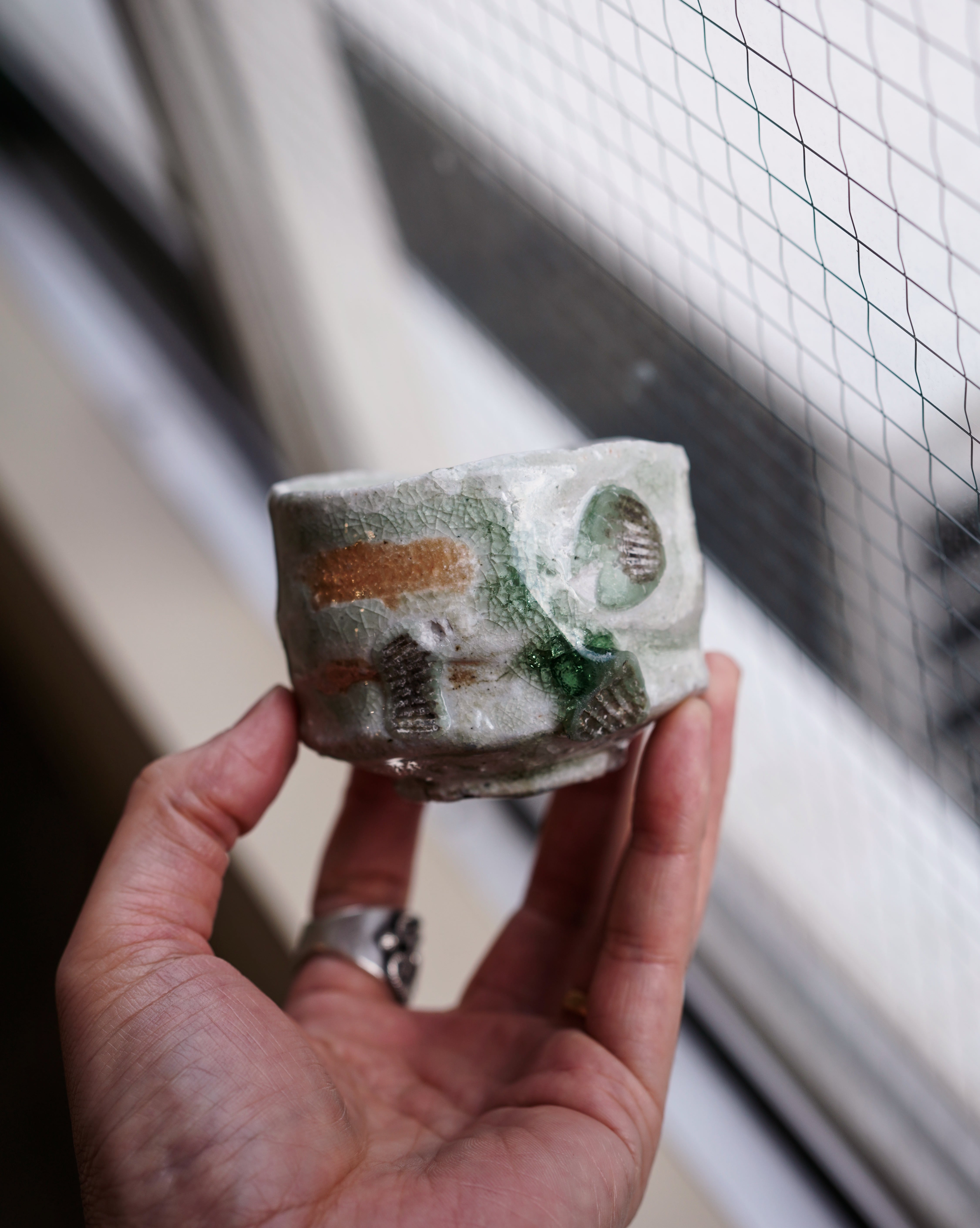 須釜さんの作風は伝統的な伊賀焼で、灰が溶けて緑のガラス質となった美しいビードロが特徴の作品です。